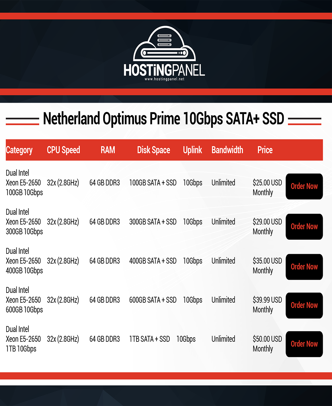Processor: 2x Intel E5-2630 v4(40 Threads) | RAM: 64GB DDR4 | Port: 10Gbps (Full Duplex) | Location : NL | Storage 100 GB | Order: $29.99/Mo