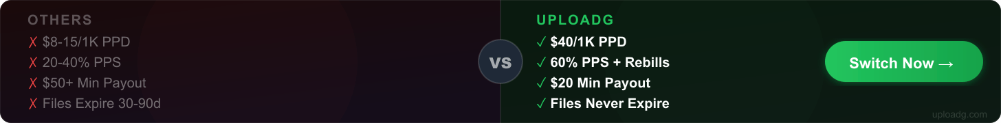 Premium Plus Uploadg.com — PPD $40/1K | 60% PPS + Rebills | 999TB Free | Daily Payouts