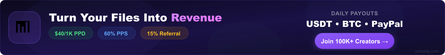 Uploadg is a file hosting platform where you upload files, share download links, and get paid for every download. We offer the highest PPD rates in the industry, 60% PPS commission with recurring rebills, and same-day crypto payouts.